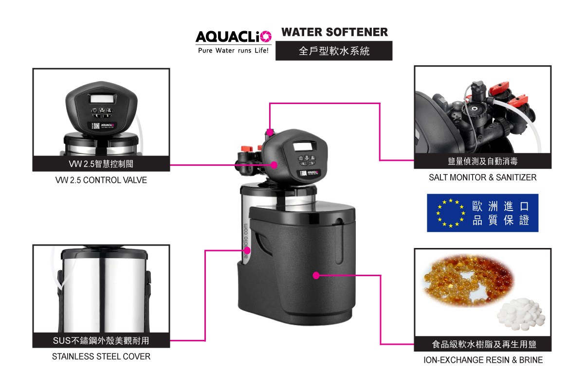 ● AQUACLiO旗艦型軟水系統,SUS不鏽鋼外殼美觀耐用,體現歐洲精湛工藝與製造技術。