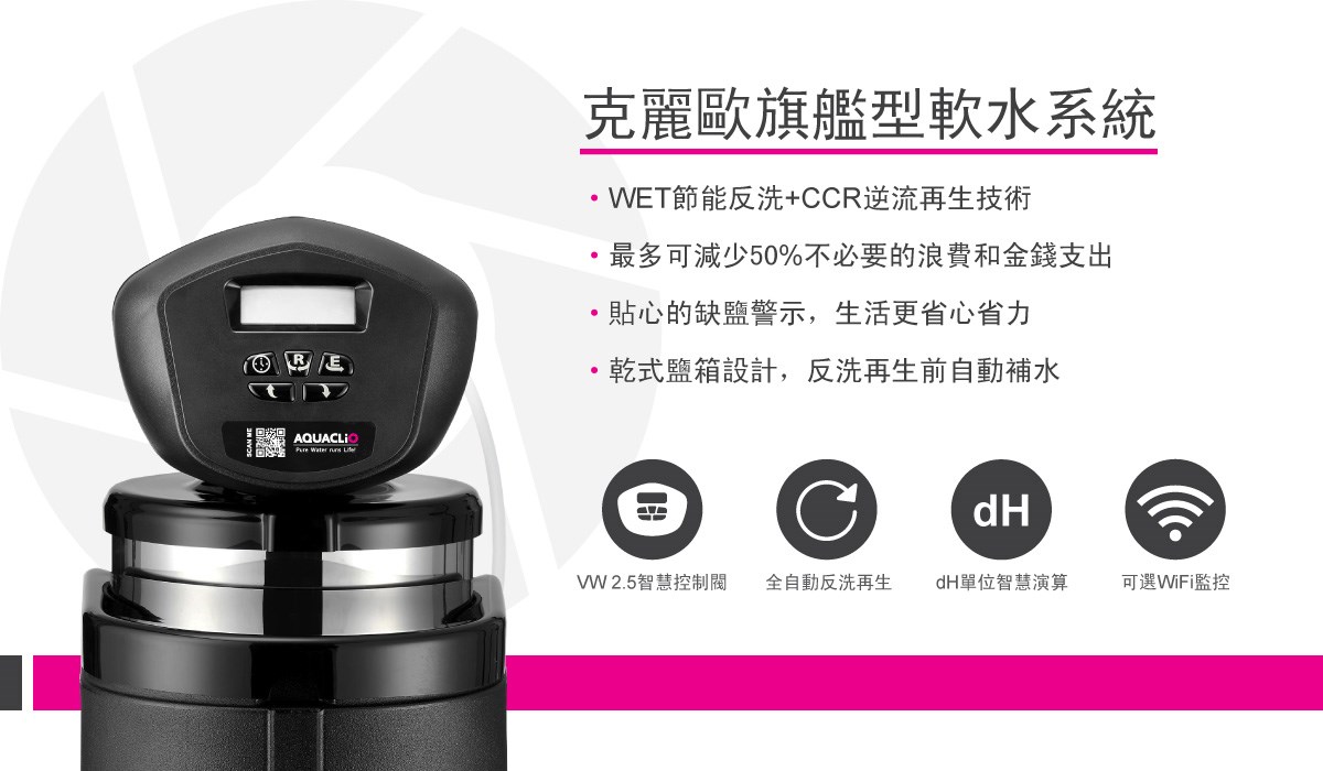 AQUACLiO克麗歐旗艦型軟水系統,WET節能反洗技術,動態調整耗水及耗鹽,最多可減少50%不必要的浪費和金錢支出。貼心的缺鹽警示,提醒添加軟化鹽,讓生活更省心省力。
