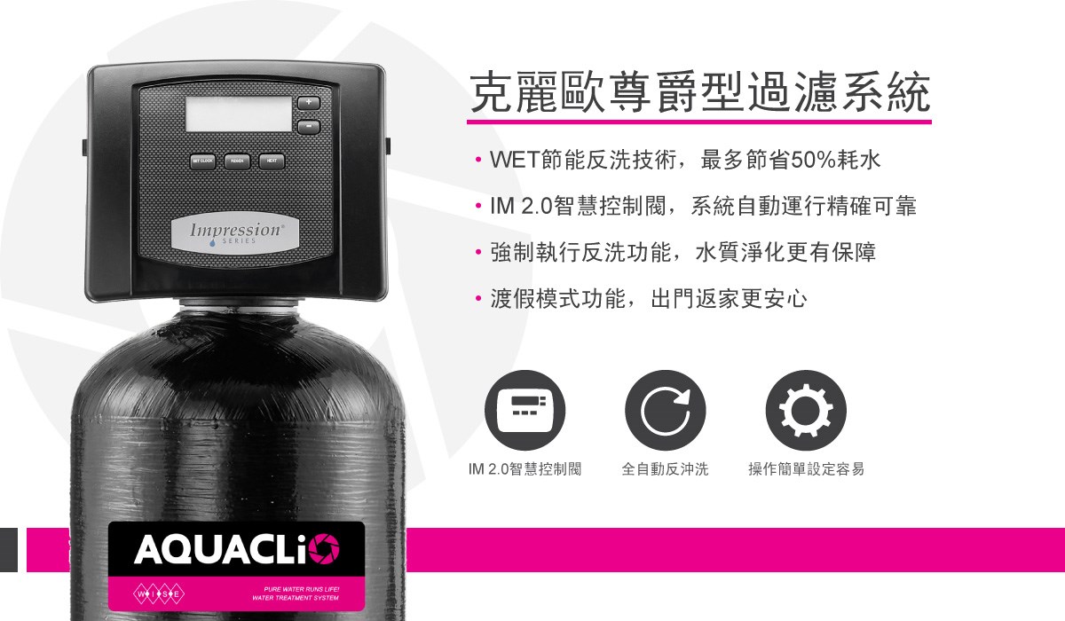 AQUACLiO克麗歐尊爵型抗菌雜質過濾系統,IM 2.0智慧控制閥搭配AFM®活性抗菌濾料,不但有效過濾水中泥沙、顆粒雜質...等汙染物,還能防止生物膜形成,保障全家人生活用水健康。