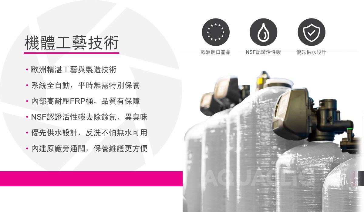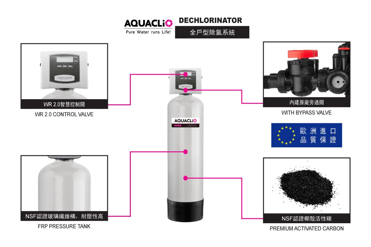 AQUACLiO克麗歐晶鑽型中央降氯淨水系統,WR 2.0智慧控制閥搭配椰殼活性碳,可選擇除氯或降氯功能,有效過濾水中餘氯,遠離氯對人體、皮膚、頭髮及呼吸道的傷害。